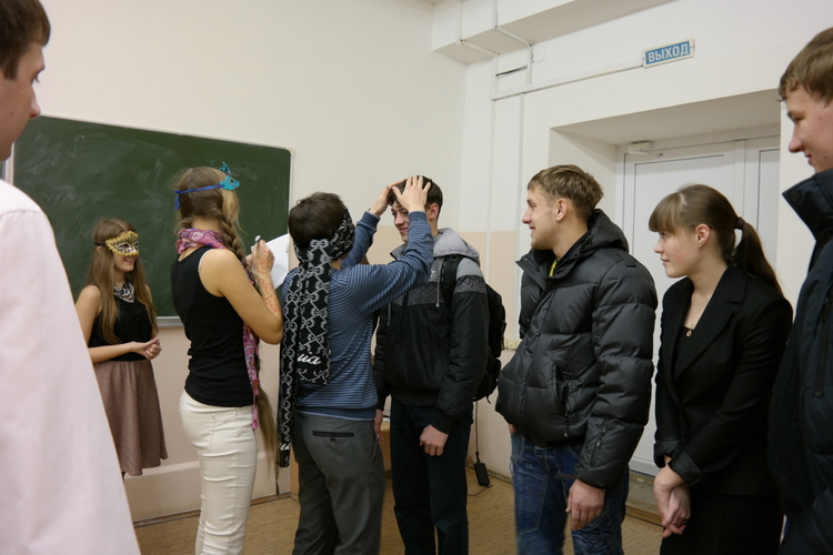 После торжественного представления каждая из 9 команд получила маршрут со станциями в разных корпусах ОмГТУ, где они выполняли задания и получали за них баллы. Например, на одной из таких станций нашим первокурсникам пришлось отгадывать известных личностей только по их глазам.