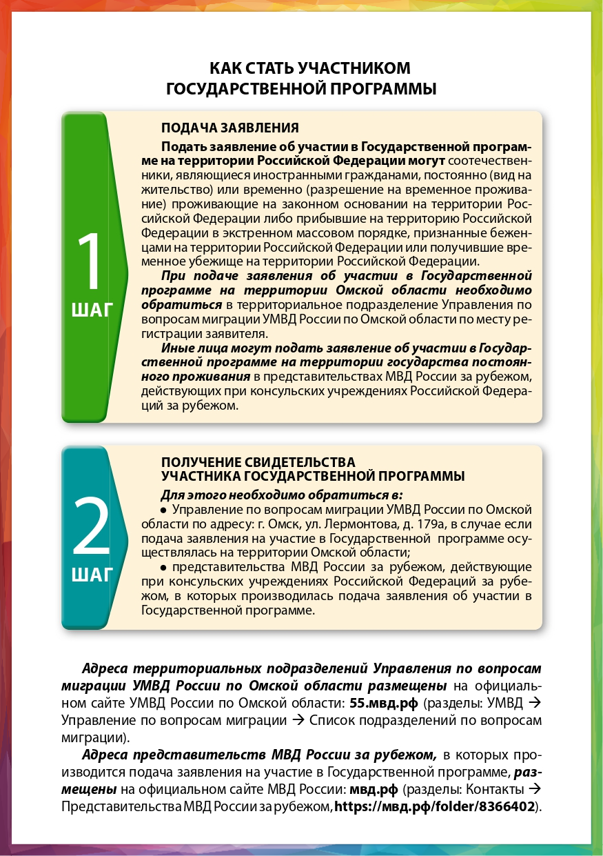 подать заявление об участии в территориальное подразделение Управление по вопросам миграции УМВД по Омской области по месту регистрации заявителя либо в представительство МВД за рубежом;