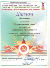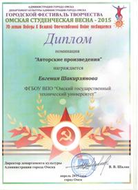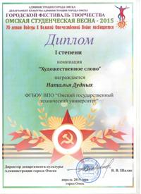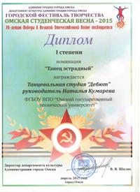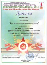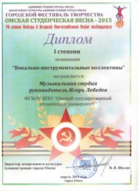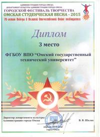 7 апреля 2015 года в Омском государственном музыкальном театре Департаментом культуры Администрации омской области были подведены итоги городского фестиваля творчества «Омская студенческая весна – 2015», посвященного 70-летию Победы в Великой Отечественной войне.