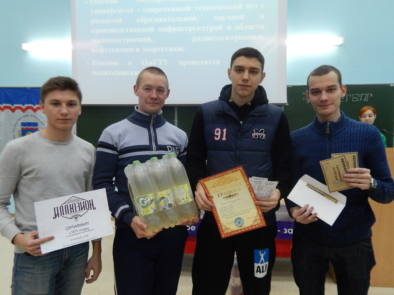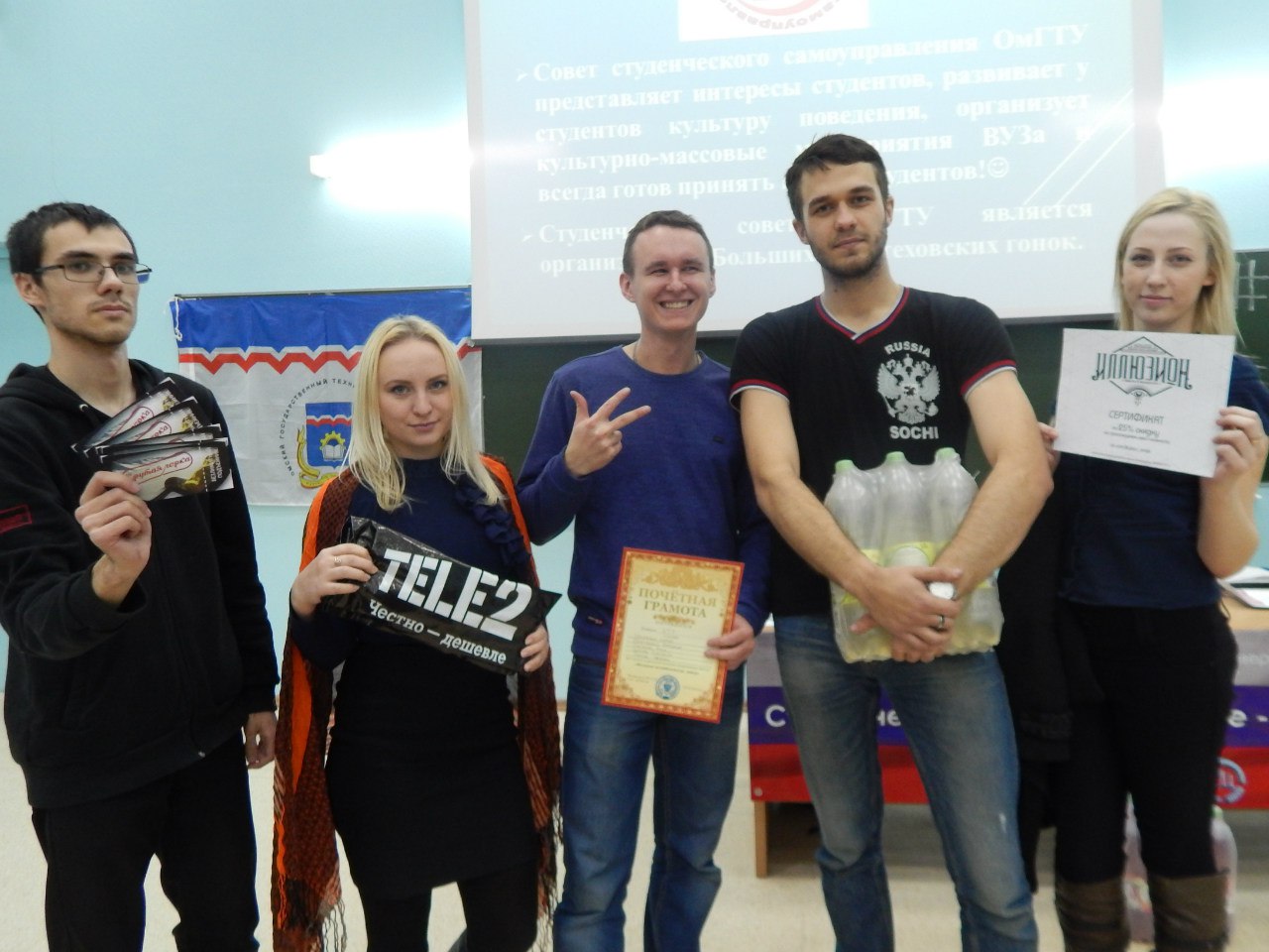 Совет студенческого самоуправления выражает благодарность спонсорам: Сноупарку «Крутая горка», Квестам в реальности «Иллюзион», Кофейне «Skuratov», компании Теле2 и конечно постоянным партнерам компании «Go on», чью продукцию вы можете приобрести в местах общественного питания ОмГТУ!