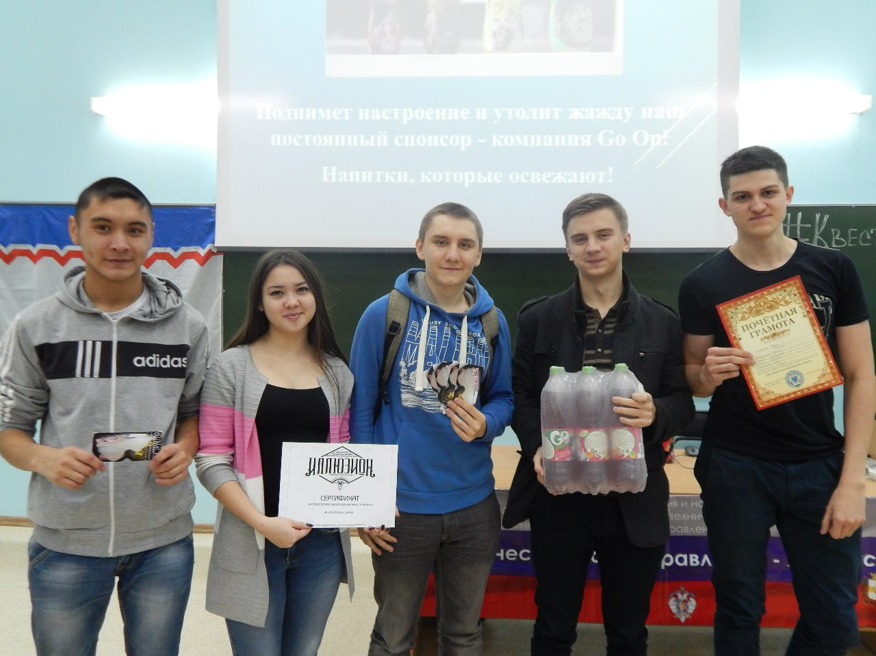 Ребята выиграли Сертификат со скидкой на прохождение Квеста от компании «Иллюзион», сертификат на безлимитный подъемник от Сноупарка «Крутая горка», сувенирные подарки от компании Теле2, а так же газированную воду компании “Go on”!