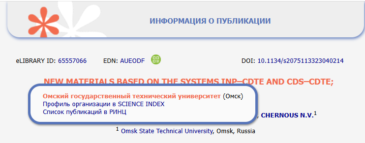 5. Если публикации нет в файле с данными о КБПР, или у Вас возникли проблемы с работой в системе на платформе Elibrary, обратитесь в Научно-библиографический отдел Научно-технической библиотеки ОмГТУ (ауд. 6-245а) для актуализации данных профиля и библиографического описания: начальник отдела Дугина Светлана Николаевна, телефон: (3812) 60-52-24, внутренний: 2258, email: ibs@omgtu.ru, mba@omgtu.ru
