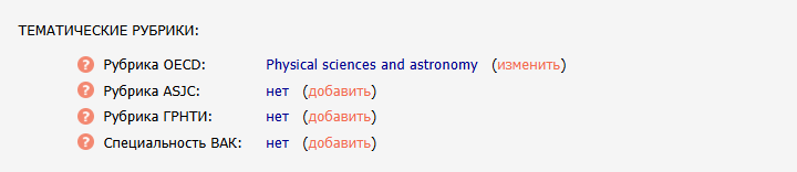 4. Проверьте, что в Ваших публикациях указаны научные тематические рубрики (рис. 3). Для публикаций, у которых в файле с КБПР не рассчитаны баллы – автору необходимо в описании публикации указать тематические рубрикаторы (обязательно OECD и ГРНТИ).