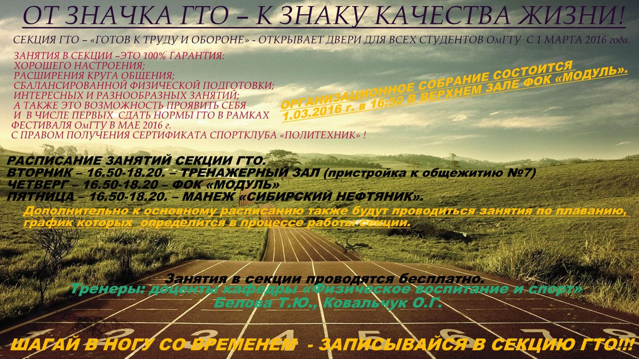 СЕКЦИЯ ГТО – «ГОТОВ К ТРУДУ И ОБОРОНЕ» - ОТКРЫВАЕТ ДВЕРИ ДЛЯ ВСЕХ СТУДЕНТОВ ОмГТУ c 1 МАРТА 2016 года.