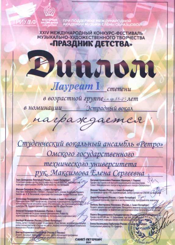 По результатам конкурсного отбора вокальный ансамбль «Ретро» ОмГТУ завоевал диплом лауреата Iстепени, кубок и медали в номинации «Эстрадный вокал» категории 18 лет и старше.