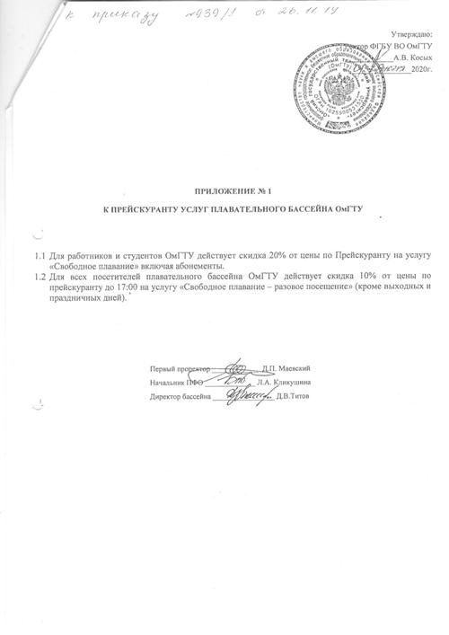 Уважаемые студенты и сотрудники! С 01.01.2020 вводится новый прейскурант платных услуг плавательного бассейна ОмГТУ, ознакомиться с которым вы можете ниже. По всем вопросам обращаться в службу проректора по внеучебной работе и социальным вопросам, Г-231, телефон 65-33-43.