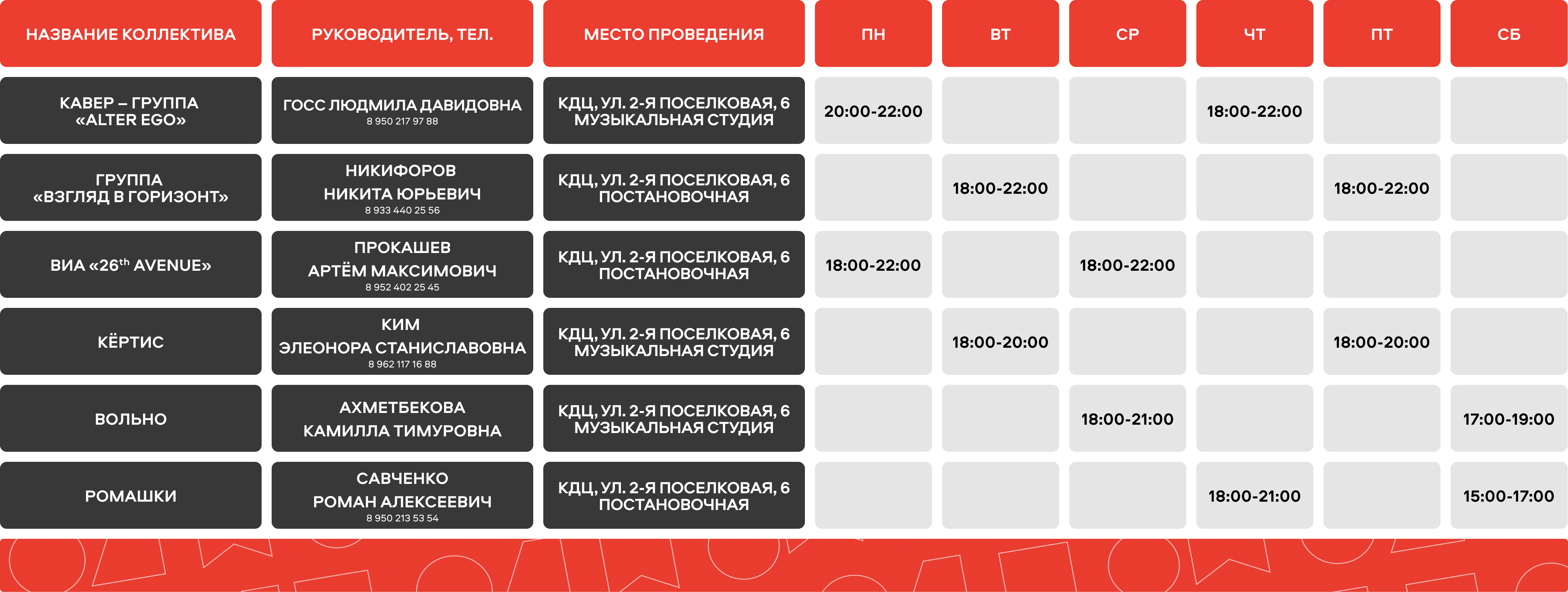 Музыкальная студия с удовольствием принимает в свои ряды не только тех, кто имеет базовое музыкальное образование, но и любителей, желающих развивать природную музыкальность, молодых людей, пробующих сочинять собственные песни.С сентября 2025 года Музыкальной студией руководит Ольга Геннадьевна Ясас, известный в городе режиссёр, организатор больших мероприятий и праздничных событий. Студия объединяет по — прежнему несколько творческих коллективов: джазовая кавер — группа «Alter Ego», ВИА 26th Avenue», Группа «Взгляд в горизонт», и новая команда «Teddy». Ещё есть время в графике репетиций и место для размещения новых музыкантов. Приходите. Ниже расписание занятий. Ждём!
